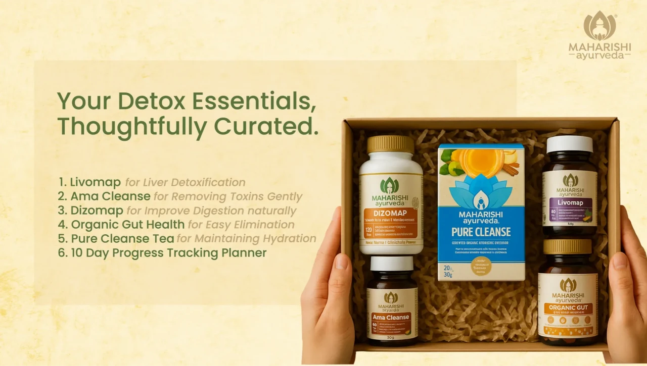 This 10-Day Do-at-Home Ayurvedic Detox Course is designed to gently restore gut health, boost Agni (digestive fire), and eliminate Ama (toxins) from the body, helping you feel rejuvenated, light, and renewed, almost like a fresh start for your system. Each day combines guided routines, and authentic Ayurvedic practices to build stronger Ojas (vitality), Supported by a specially curated product kit with herbal supplements and wellness aids, it brings authentic Ayurveda into your daily life. It easy to follow, deeply restorative, and crafted to make you feel revitalized, even with a busy schedule.